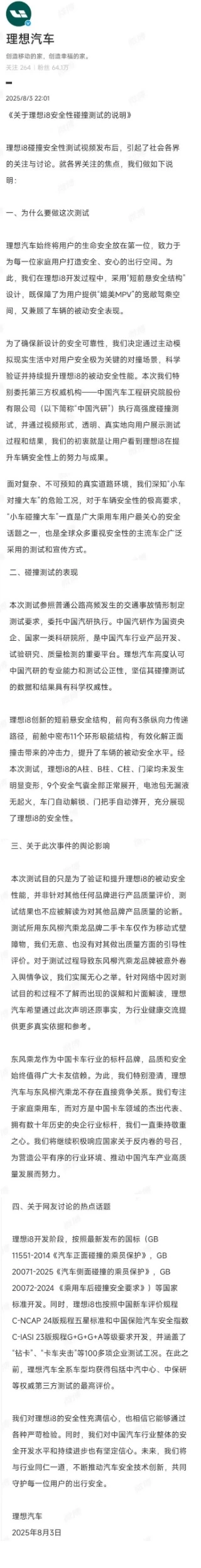 理想汽车在《关于理想 i8 安全性碰撞测试的说明》中提到此次测试的原因、碰撞测试的表现、关于此次事件的舆论影响和关于网友讨论的热点话题四个方面。