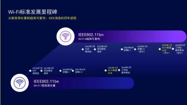 • Wi-Fi 8正在定义中,其目标是在复杂的现实环境中优先保障可靠的性能表现,即使在网络拥塞、易受干扰且移动性强的场景中,也能提供出色的连接。