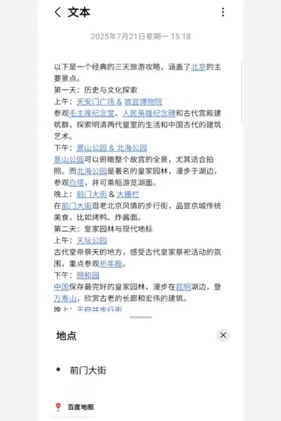 三星Galaxy Z Flip7还有一个好用的AI功能——智能收藏,它可以帮助用户收藏文字、图片或地图定位等信息,并完成自动分类归档,以便下次查看能快速找到,同时还会提供一些其他联动服务。比如,当用户阅读到一篇实用的旅游攻略时,只需长按内容将其拖放至智能收藏,然后点选“查看提及地点”、“马克地图”,AI就会将攻略中所有涉及的景点标注在百度地图中,并且还会智能规划出游每一天的具体线路。这样易用和实用的体验不仅避免了切换应用程序的麻烦,更让信息管理不再如大海捞针般难寻,而是快捷到一键搞定。