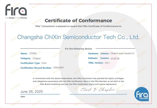 2025年6月26日,全球领先的UWB车规级芯片方案提供商长沙驰芯半导体传来喜讯,其CX500系列车规级UWB SoC芯片成功通过FiRa™ Consortium最新发布的FiRa Core 3.0认证,其中包含CCC数字钥匙全栈协议。驰芯半导体成为国内首家完成该标准全部测试用例并通过认证的芯片设计企业,这一成果在UWB技术产业化进程中具有里程碑意义。