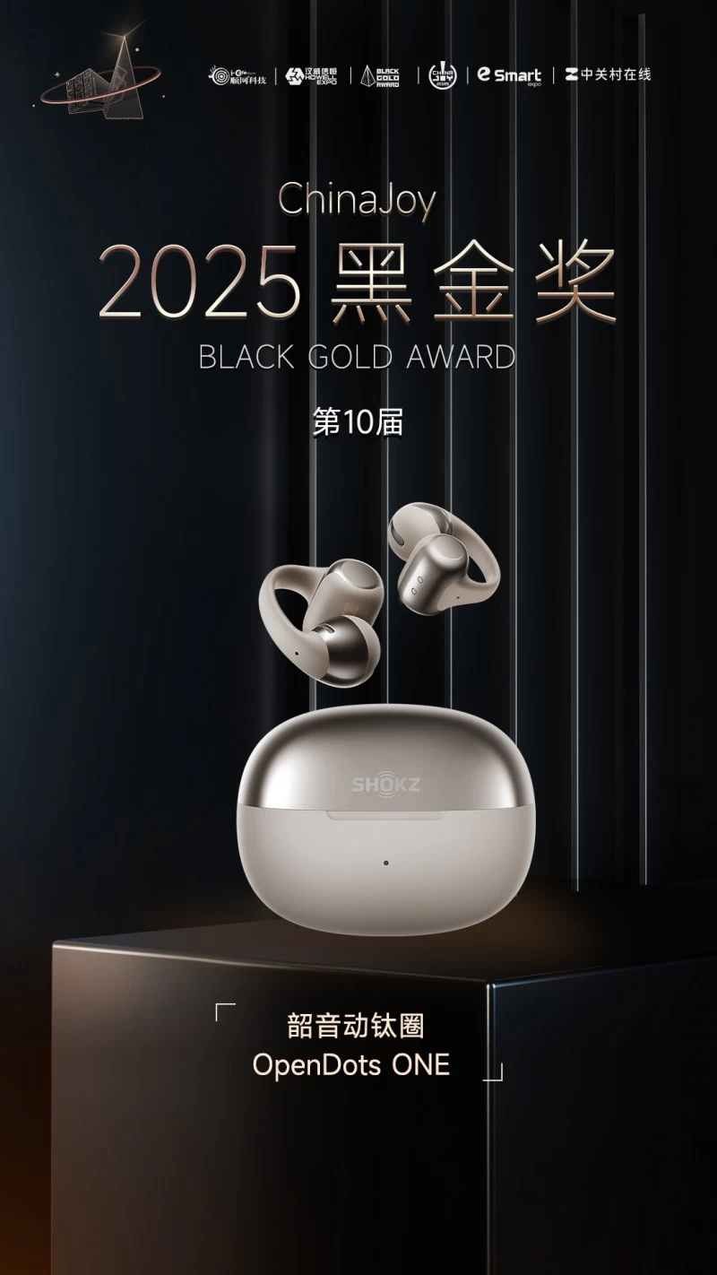 展会期间,第10届ChinaJoy黑金娱乐硬件奖(Black Gold AWARD,简称黑金奖)正式揭晓。韶音开放式耳机OpenDots ONE凭借优秀的设计、领先的开放式技术、舒适的佩戴效果以及卓越音质表现,成功斩获2025年度ChinaJoy黑金奖。