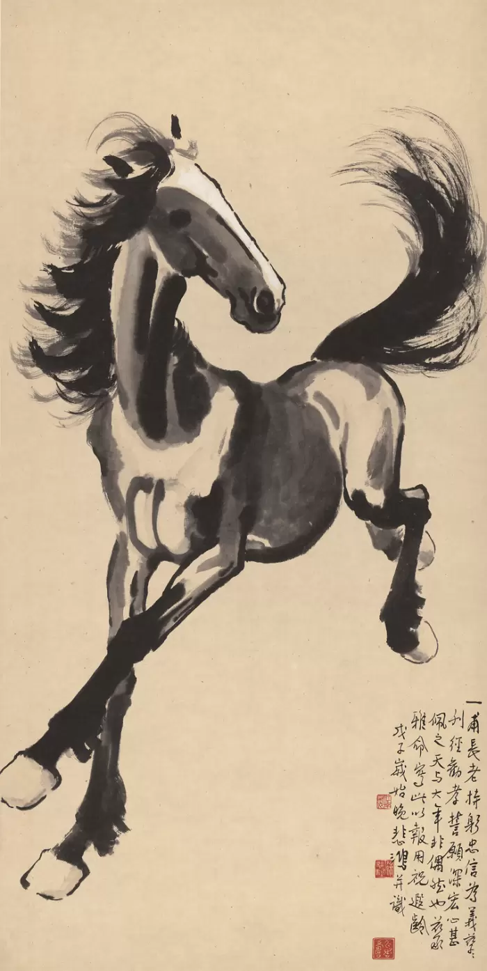 我们凝望大师笔下“昂首嘶鸣、四蹄生风的骏影,捕捉其神韵中蕴含的”雄伟气势与坚韧不屈。