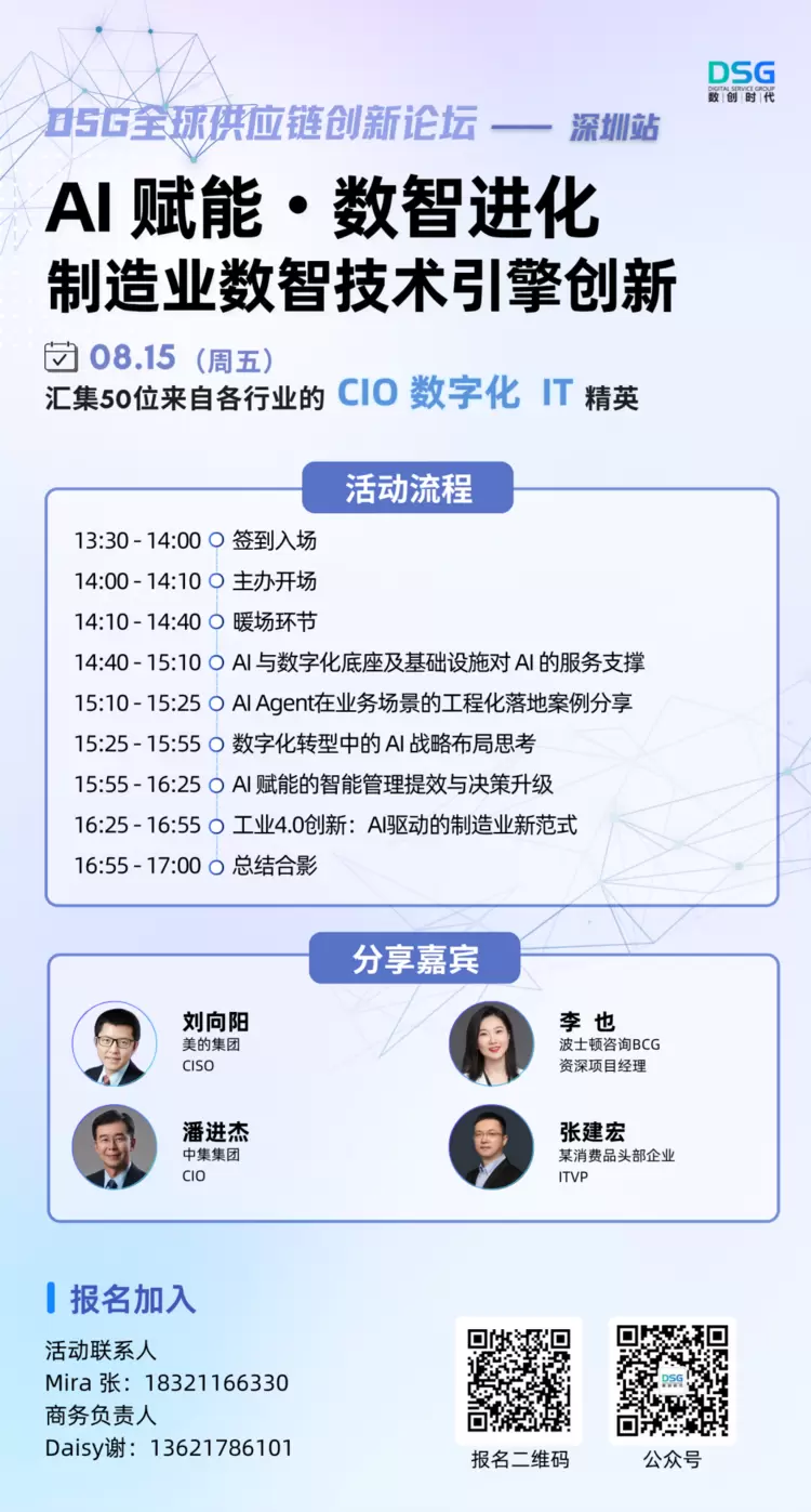 8月15日深圳,制造业CIO齐聚,美的CISO、BCG资深大咖同台,解码AI重构IT底座!