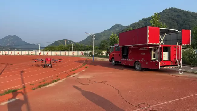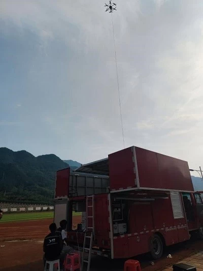 8月1日凌晨四点,卓翼智能应急团队抵达灾区,通信恢复是救灾生命线,必须调动一切科技力量打通信息孤岛,面对灾区道路中断、电力瘫痪的恶劣环境,卓翼智能立即与中国电信启动联调。根据灾情评估和应急通信保障任务要求,卓翼智能此次采用自主研发的超大载重系留无人机平台,创新整合综合运输车,通过TS-X12系留无人机挂载中国电信通信基站,形成“一机多模”的智能无人机应急通信保障技术方案。