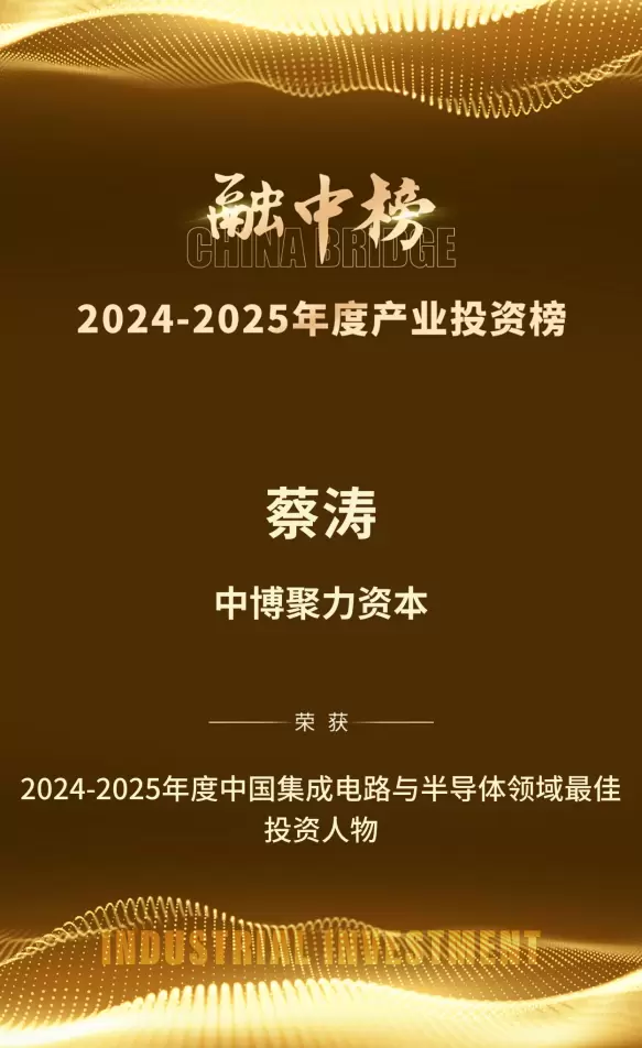7月23日-25日,由融中财经、上海天使会主办的“2025中国科创投资夏季峰会”上,《融中2024-2025年度中国产业投资榜单》盛大发布,中博聚力资本荣获“2024-2025年度中国集成电路与半导体领域最佳投资机构”,公司合伙人蔡涛被评为“2024-2025年度中国集成电路与半导体领域最佳投资人物”。