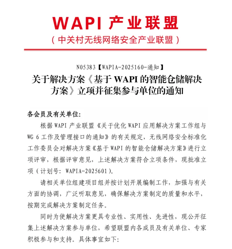 为服务WAPI技术落地应用,WAPI产业联盟于2023年组织成立WAPI应用解决方案工作组(以下简称“方案组”)。方案组的核心职责是紧扣市场需求,组织产学研用各方力量,协同开发针对各细分行业、细分场景的WAPI解决方案,助力高质量安全无线局域网建设与发展。2025年,联盟进一步优化方案组与无线网络安全标准化工作委员会特别任务管理工作组(WG6)的工作接口及管理机制,明确在解决方案项目开发中,若涉及团体标准制修订需求,由WG6统筹协调立项,形成“方案开发-标准完善”的联动机制,为技术应用提供标准支撑。
