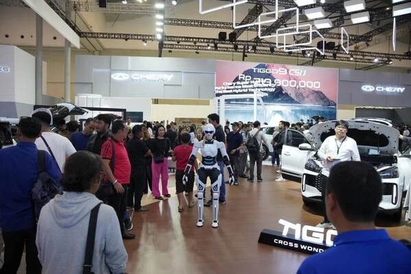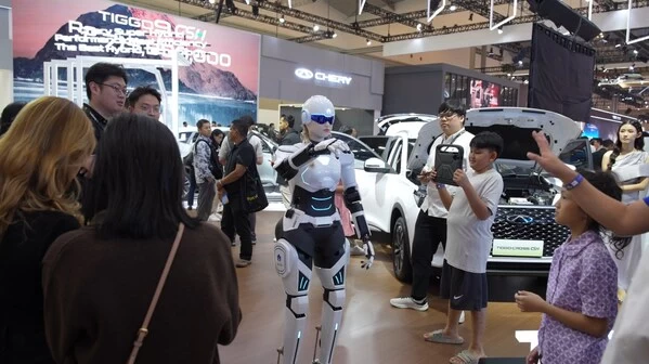 东南亚最具影响力的汽车盛会——印尼雅加达国际车展(GIIAS 2025)上,印尼工业部长Dr. Agus Gumiwang Kartasasmita亲临奇瑞展台,首款墨甲机器人"墨茵Mornine"识别并主动以印尼语问候,她以平稳、自然的语速介绍奇瑞主力混动车型Tiggo Cross CSH在节能和续航方面的核心优势。部长对机器人自然的交互和专业的服务能力予以充分肯定,现场观众也表现出极大的兴趣,纷纷参与互动体验。