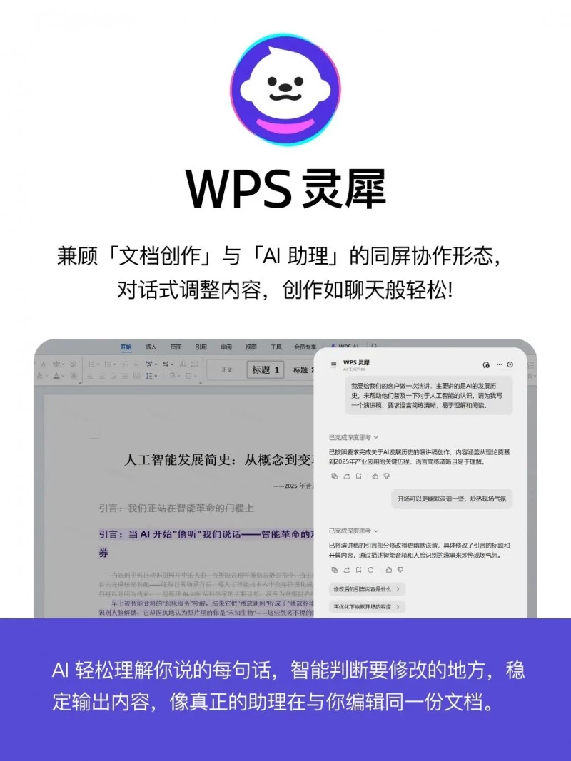 用户只需通过自然语言与“WPS灵犀”对话即可完成文档创作、演示文稿生成等功能,全程无需复杂操作和外部跳转。“WPS灵犀”具备多轮对话、修改可控、格式保留等优势,是真正可用可控的 AI 助手。