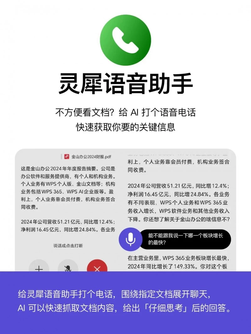 升级后的 WPS AI 3.0,首先体现在语音交互上。现在,当用户不方便看文档时,给“灵犀语音助手”打个电话,就可以快速获取想要的关键信息。