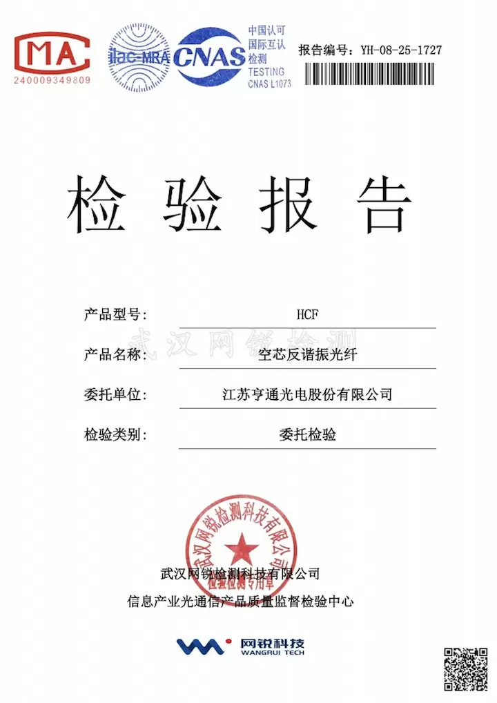 其中,亨通光电空芯反谐振光纤已通过网锐科技(信息产业光通信产品质量监督检验中心)检验,检测结果各项指标性能合格。