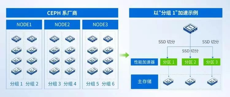传统Ceph方案存在致命缺陷,通常采用SSD与HDD混合加速方案:将存储池按冗余策略(如EC4+2)划分为多个分组,每个分组绑定一块SSD,并将该SSD划分为多个独立分区,每个分区专用于加速组内一块HDD。