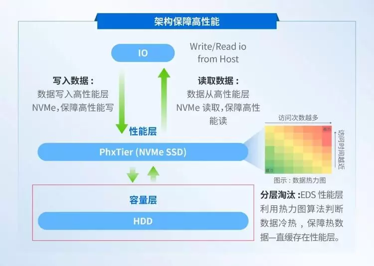 前端业务读写100%由SSD性能层承载,基于热力图智能识别热数据,确保高频I/O全闪存响应,随机读写性能提升10倍以上,时延降至亚毫秒级。