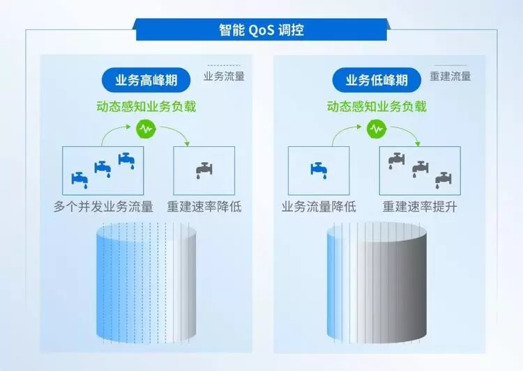 业务高峰期:自动降低数据重建的任务并发数和任务优先级,优先保障业务资源供给,避免性能波动。