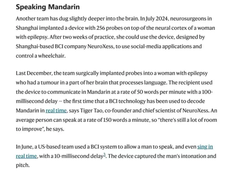 在政策鼓励和科研积累的双重驱动下,我国脑机接口领域正不断取得突破性进展。今年7月,国际权威学术期刊《Nature》发表了题为《China pours money into brain chips that give paralysed people more control》(中国全力推进脑芯片技术,助瘫痪患者重获控制能力)的论文,深度报道了中国在侵入式脑机接口领域的重大技术成果,重点聚焦优刻得合作伙伴脑虎科技的两项临床试验成果——实时运动解码与实时汉语言解码技术,标志着其核心技术获得国际顶级学术期刊的高度认可。