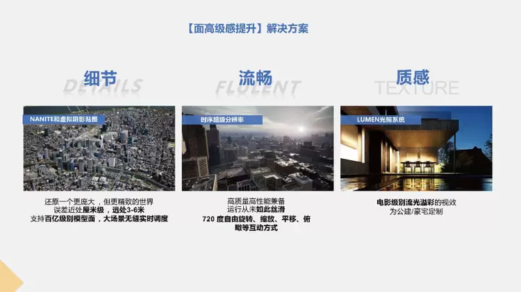 据了解,该CIM系统核心突破在于技术与场景的深度融合。依托UE5的NANITE技术与虚拟阴影贴图,系统可还原误差近至厘米级、远达3-6米的庞大场景,支持百亿级别模型面的无缝实时调度;搭配LUMEN光照系统,更实现电影级流光溢彩的视效呈现,为豪宅、公建项目定制超写实视觉体验。同时,通过时序超级分辨率技术,系统实现720度自由旋转、缩放等交互操作的丝滑运行,并创新达成iPad与LED屏的同屏画面同步,让便携设备与大型展示终端形成体验联动。
