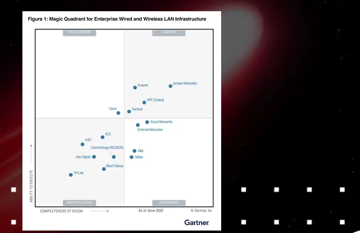 2025 年,连续第二年获评 Gartner® 企业级有线和无线局域网基础设施魔力象限™ 领导者。