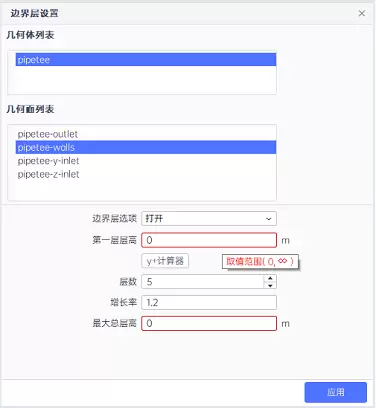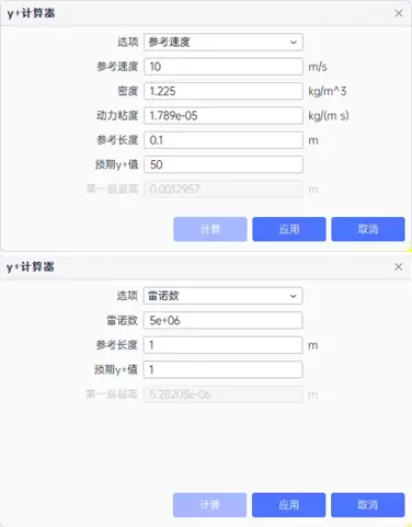在边界层网格的参数设置中,“第一层层高”数值与“最大总层高”数值联动,调整其中一个,同步更新另一个。“最大总层高”并不保证所有位置的边界层高度都能达到设置值,具体生长的最大高度将随几何特征的不同而有所不同。新增Y+计算器,可以通过指定参考速度或雷诺数的方式,自动计算出满足Y+要求的边界层网格第一层层高。