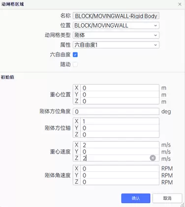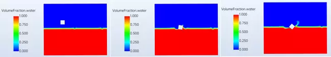 支持瞬态条件下,六自由度和重叠网格组合使用,六自由度模型负责计算出运动物体的加速度和角加速度,瞬态更新物体的位置和姿态。例如方形木块斜抛入水的案例。