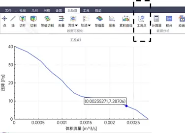 后处理中支持对风扇工作点(计算当前结果风扇的流量和压力)的显示,支持自动获取前处理中定义的风扇PQ曲线,也支持从外部数据导入显示PQ曲线。