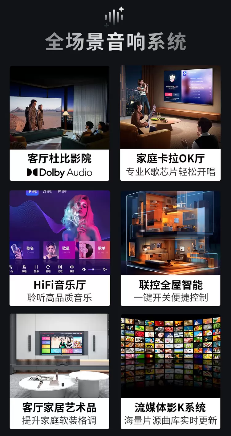 影院模式:震撼全景声/环绕立体声,精准还原电影原声,低频如惊雷滚地而不混浊,中频人声穿透心灵,高频细节如水晶般清亮。不是置身影院,而是让影院臣服于你的客厅。足不出户,即可沉浸于大片现场,沙发就是你的黄金席位!