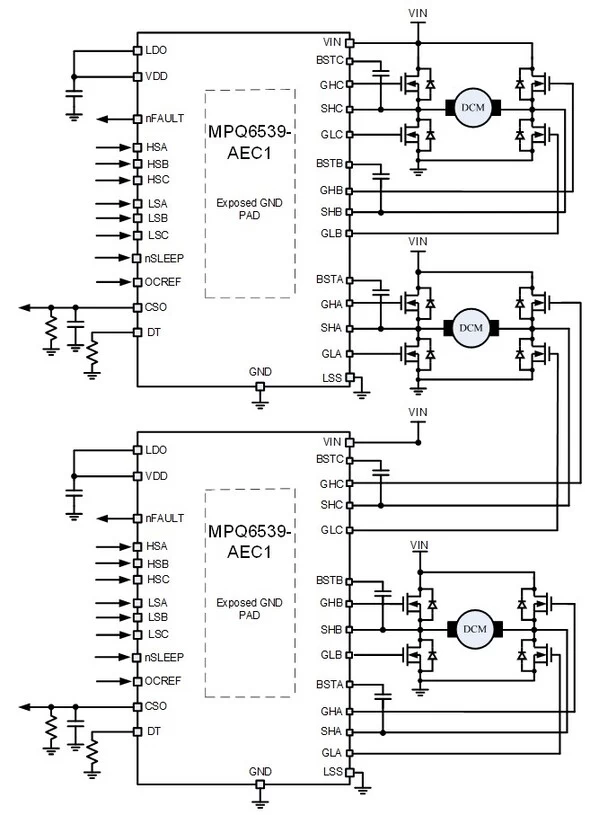 此外,MPQ6539-AEC1可驱动由四个N沟道功率MOSFET组成的一个H桥的车规级栅极驱动器。将两颗MPQ6539-AEC1级联,可驱动由十二个N沟道功率MOSFET组成的三个H桥的车规级栅极驱动器,满足三个直流有刷电机(BDC)的驱动需求。