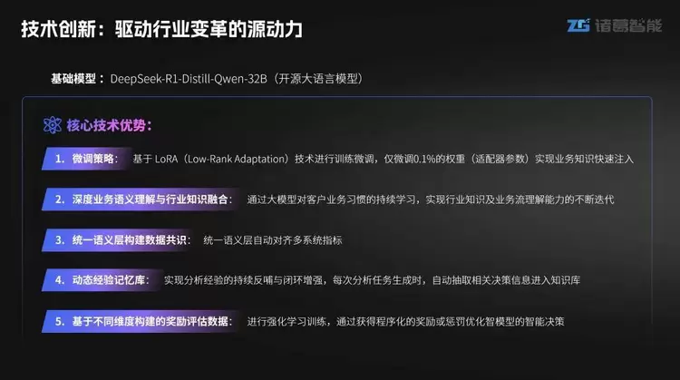 从技术角度看,诸葛智能分析师Agent的核心技术包含五大支柱:独特的微调策略、深度语义理解与行业知识融合、统一语义层自动对齐多系统指标、动态经验记忆库,以及基于多维奖励评估的闭环学习机制。