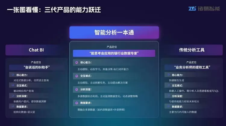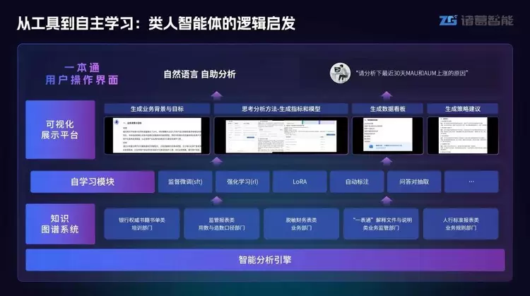 诸葛智能“分析师Agent”,通过对城商行、证券、消金等领域的业务场景、行业知识及过往经验进行深度学习训练,实现了智能化数据分析洞察及决策建议的全面输出。
