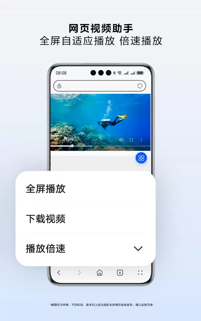 当开启了视频助手功能,在华为浏览器中播放网页视频时,会自动显示视频助手悬浮按钮。点击悬浮按钮,其中包括全屏自适应播放、下载视频、播放倍速三大功能。