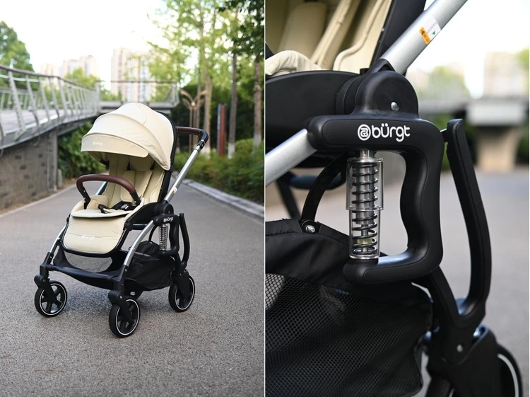 布格特婴儿推车是在传统弹簧缓震的基础之上,自主研发了婴儿推车液压避震器,通过多连杆悬挂结构,将液压避震器设计嵌入车架中控位置。也就是说,当婴儿乘坐推车时遇到颠簸,车轮所遇到的颠簸能量会通过多连杆悬挂避震系统,将颠簸震动能量传递导入液压避震器中,由避震器将颠簸能量消耗,从而保障宝宝在推车内的舒适度,减少颠簸产生的不适。这一避震原理和产品呈现方式,在目前全球婴儿推车领域内都是比较创新的产品及理念,在很大程度上推动了婴儿推车行业避震新时代的变革。