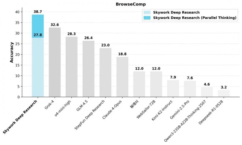 在权威的搜索评测榜单BrowseComp上,Skywork Deep Research的表现尤为突出。常规模式下,其性能已超越大多数同类产品,正确率达到27.8%。而一旦开启自主研发的“并行思考”(Parallel Thinking)模式,正确率更是跃升至38.7%,刷新了行业SOTA纪录。