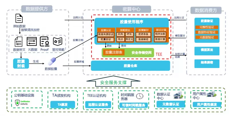 作为基于可信执行环境TEE的全密态计算平台,它融合环境、身份、算法、传输、存储、计算等多维度可信要素,实现了接近明文计算效率的密态计算效果。平台采用 “两端 + 一中心” 架构:数据提供方将加密数据与管控策略深度绑定为数据胶囊;密算中心侧在可信执行环境内,利用可信算法对数据胶囊进行联合计算,结果加密后输出至数据消费方。数据流转全程以密态呈现,关键过程经区块链存证确保可信,传输过程通过可验证证明保障安全,存储过程借助高性能密码学技术筑牢防线。