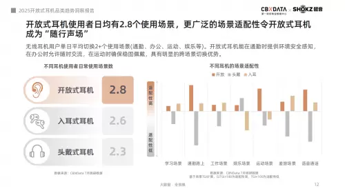 韶音的成功,源于对 用户“多场景使用” 痛点的深度洞察与产品落地。韶音自创立以来,始终以用户反馈为导向,针对不同场景、人群打造差异化产品,实现 “全场景覆盖”。《2025开放式耳机品类趋势洞察报告》数据显示,无线耳机用户单日平均切换2+个使用场景,其中开放式耳机日常使用场景数达到2.8个,优于入耳式耳机和头戴式耳机的日常使用场景数。可以看出,用户对开放式耳机的使用场景已拓展至通勤、办公、运动、娱乐等多元领域,其开放、稳固的佩戴优势更能满足全天候的听音需求。