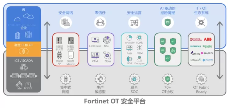 采用平台方法构建整体OT网络安全架构至关重要,Fortinet 围绕Security Fabric统一平台构建基础驱动层(ASIC、AI与生态系统支撑)、整合与融合层(FortiOS与Security Fabric)、战略能力层(安全网络、统一SASE、AI驱动的安全运营)三层安全架构,实现OT网络安全从硬件到战略的全栈防护。