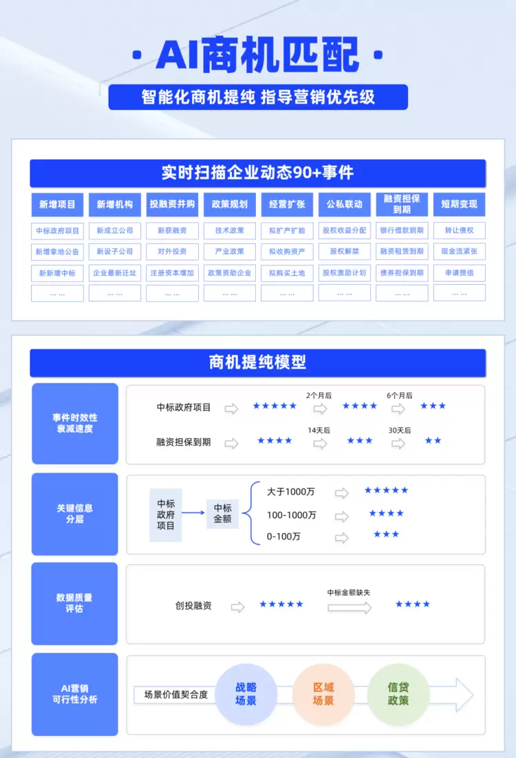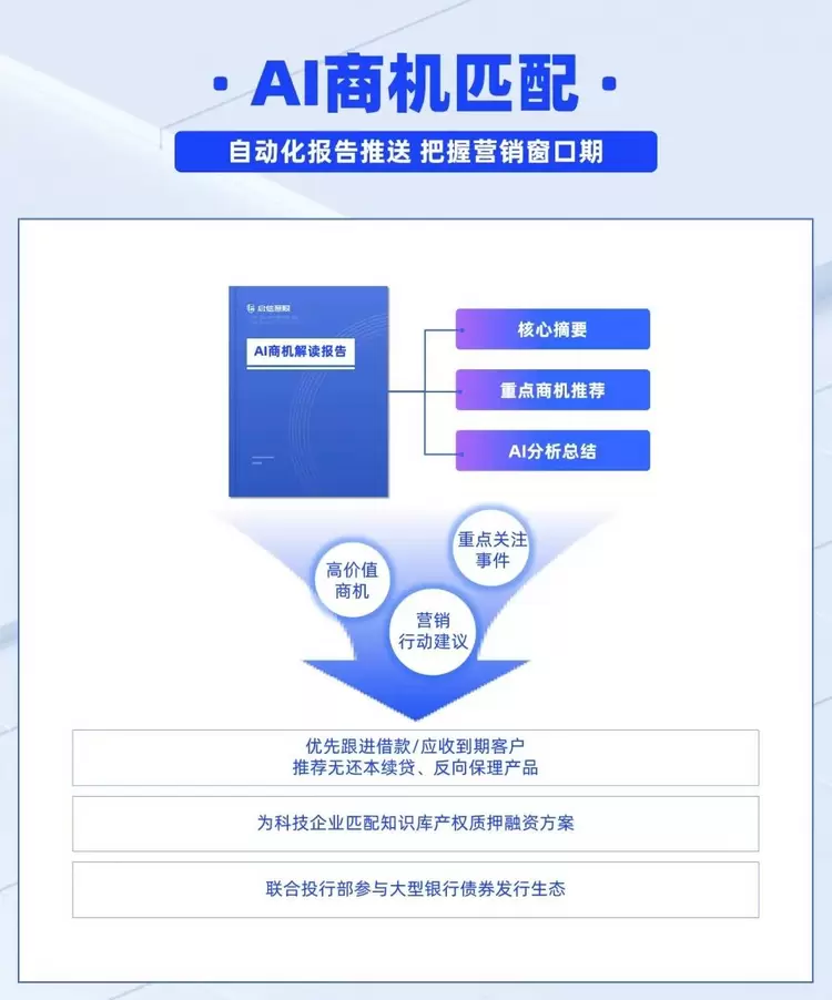 近期,启信慧眼重磅推出全新解决方案——智能决策企业级AI产品,依托前沿AI技术与海量商业数据的深度融合,加速推动从“数据查询”到“智能决策”的跨越。其中,针对商机识别、价值评估、需求匹配等一系列痛点,启信慧眼重磅推出「AI商机匹配」功能,在深度挖掘企业商机事件的基础上,智能分层提纯并动态匹配相应的金融产品,自动推送商机报告,助力银行等金融机构把握营销时机、提升营销转化。