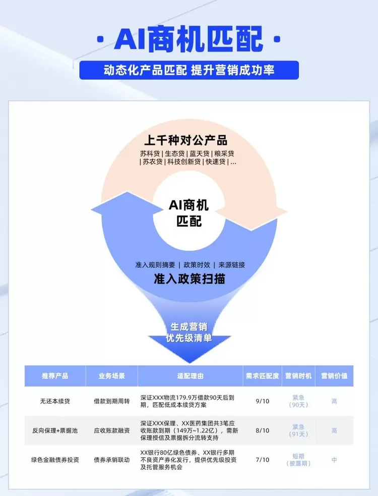 在对公营销场景下,提升营销转化率的一大核心在于“供需匹配”,如何挖掘企业真实资金需求并提供相应的金融服务,将在很大程度上影响后续的成功率。对此,「AI商机匹配」推出自定义产品推荐模型,可联动银行内部产品库与实时政策,自动生成营销优先级清单,智能匹配科创贷、供应链金融等上千种对公产品,进一步提升营销成效。