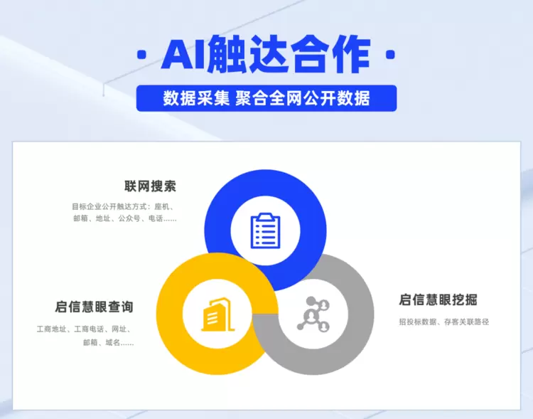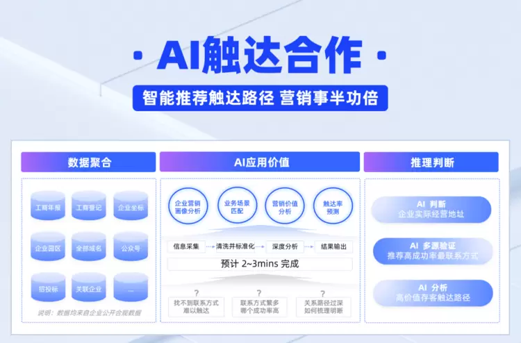 近期,启信慧眼重磅推出全新解决方案——智能决策企业级AI产品,依托前沿AI技术与海量商业数据的深度融合,加速推动从“数据查询”到“智能决策”的跨越。其中,针对触达环节的痛点与需求,启信慧眼重磅推出「AI触达合作」功能,2-3分钟即可在聚合全网数据的基础上,智能分析并推荐优先触达路径,三步破解触达困局,大幅提升营销成功率。