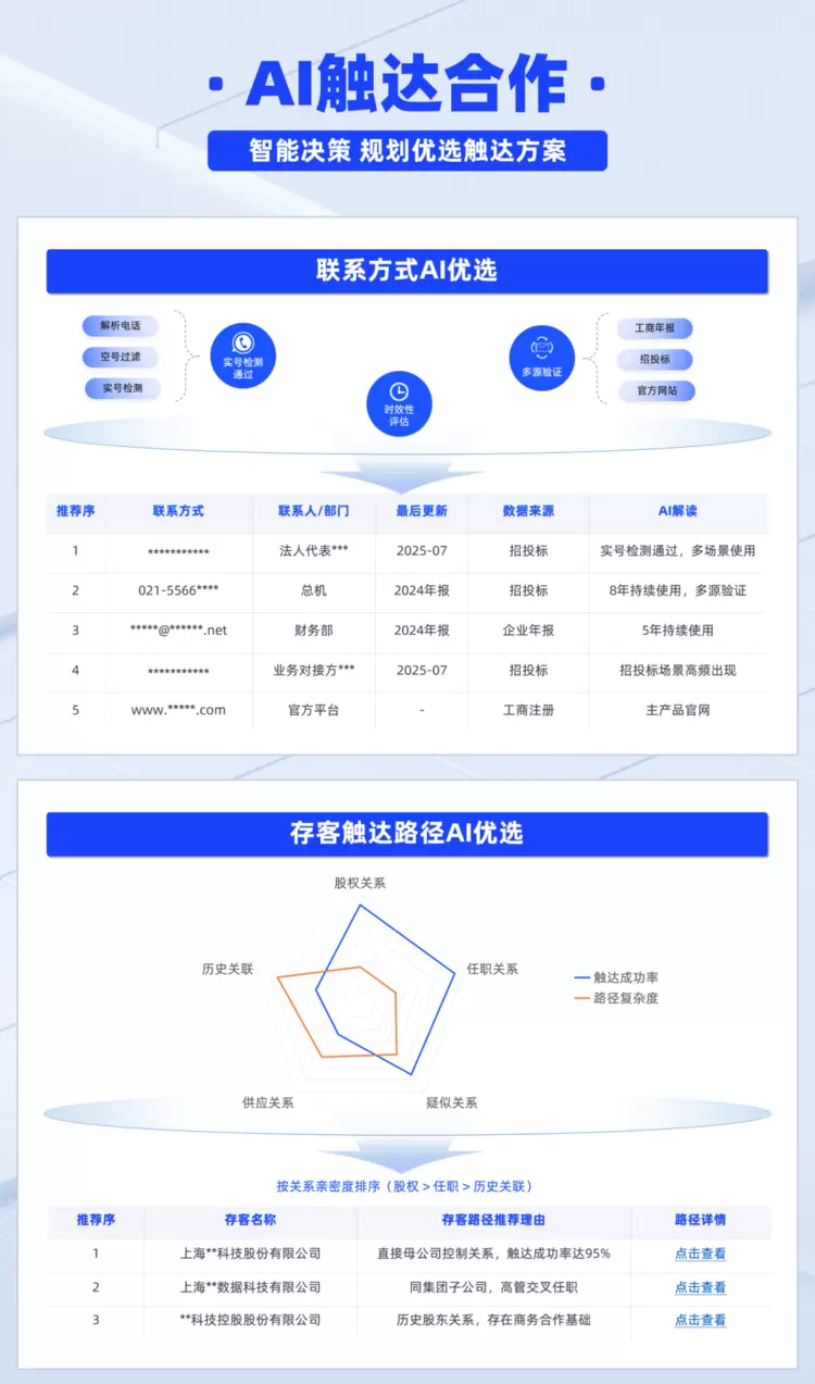 其一,联系方式AI优选:基于信息的时效性与可信度加权并排序,例如某联系方式来自本年度最新招投标公告,且该联系人属于招投标项目的直接对接人,触达成功概率显著高于其他触达路径,可作为首选触达方式。