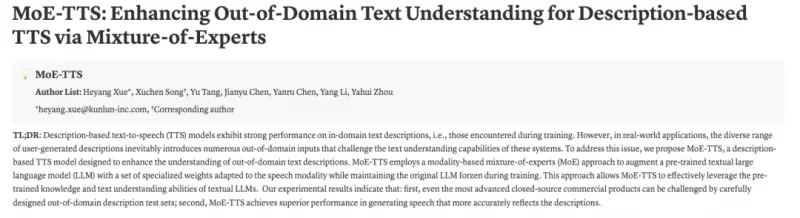技术报告:https://teal-aquarius-c17.notion.site/MoE-TTS-Enhancing-Out-of-Domain-Text-Understanding-for-Description-based-TTS-via-Mixture-of-Experts-24e44360bf708040bff3dffe2eef805e