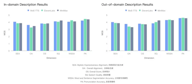 在涵盖域内与域外描述的双测试集上,MoE-TTS 与主流闭源 TTS 模型进行了六大维度对比评测:MoE-TTS 在风格表现力贴合度(SEA)和整体贴合度(OA)等声学控制上精准度领先,这正是其在复杂描述匹配度上胜出的关键。