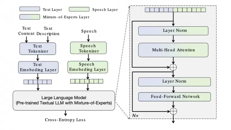 MoE-TTS的推出有望助力解决这一核心难题。该框架创新性地结合预训练大语言模型(LLM)文本能力与语音专家模块(Speech Expert Modules),为文本与语音分别配置专用专家模块,并在Transformer核心结构中引入模态路由,确保各模态独立优化、互不干扰。在冻结文本参数的同时高效对齐跨模态信息,实现“知识零损失”的泛化理解能力。