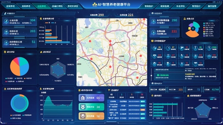 机构养老场景融合AI与物联网技术,实现健康评估、智能监护、安防巡更全流程数字化。数据同步与可视化调度优化服务响应(如一键呼叫、用药提醒),助力机构降本增效。