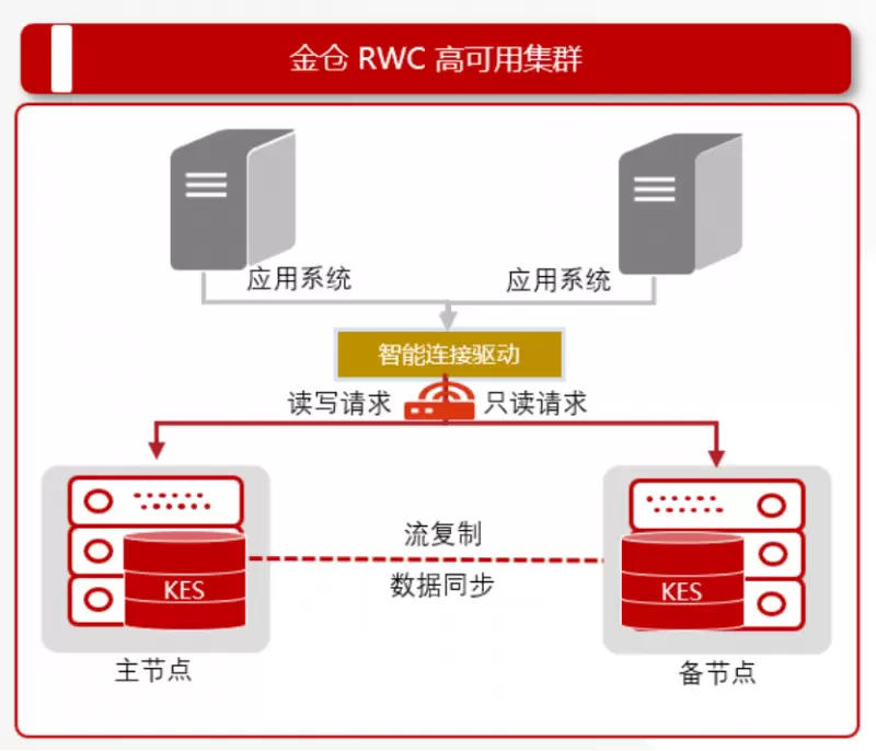 金仓数据库读写分离集群采用内网专用网络,通过高速日志传输机制,实现节点间全量数据冗余,并且主从数据库之间可保证数据实时一致性。