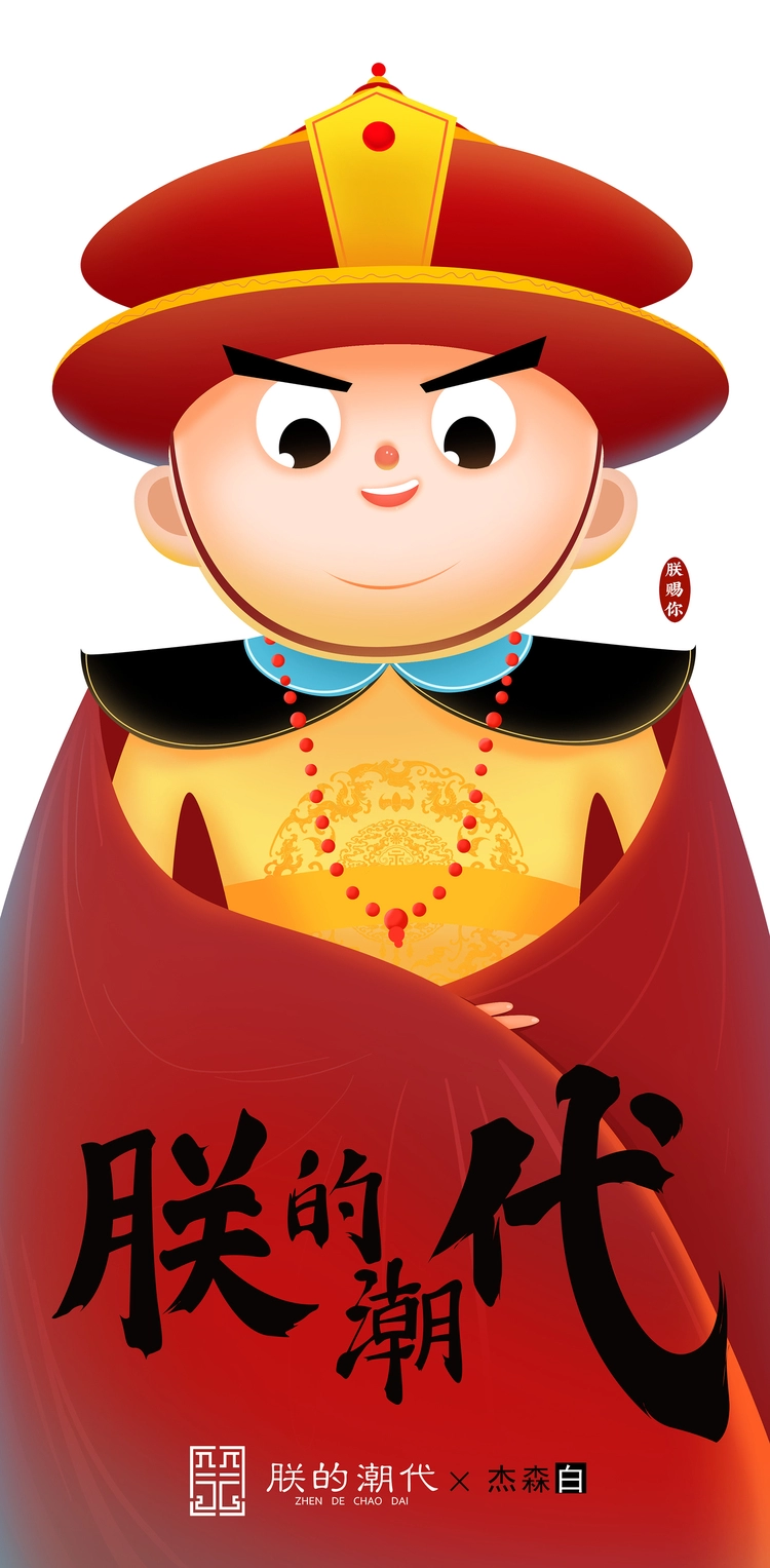 将清朝帝王形象卡通化:龙袍、朝珠、瓜皮帽保留,但表情呆萌、动作搞笑;