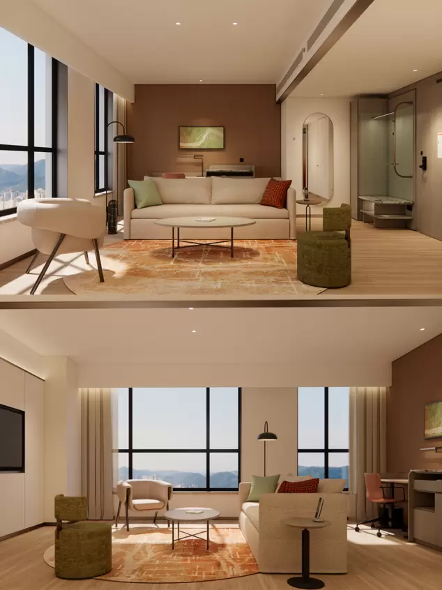 设计方面,酒店在延续“明快热诚”品牌个性的同时以“绽放的生机”为主题,从植物的生长与绽放中汲取灵感,在设计与装饰中融入花瓣、茎秆、叶脉等大自然元素。