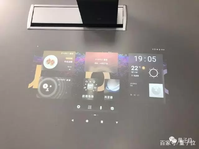 开机,这款产品内置操作系统:puppyUI 1.0,基于Android 6.0深度定制。主屏界面包括时间、天气显示,音乐播放,主版块为puppy厨房、puppy影音、puppy健身、应用市场、浏览器;子版块为设置、应用列表、麦克风等二级按钮。通过划动、点击等方式,就能进行触控操作。
