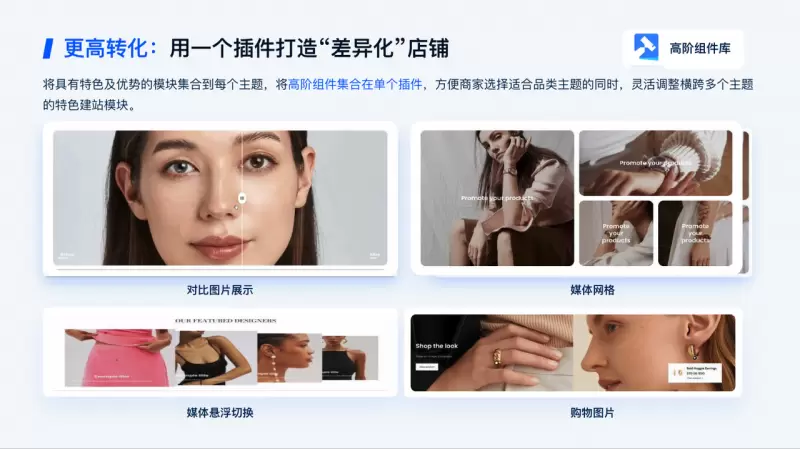 SHOPLINE为商家提供「高阶组件库」,将特色与优势模块集合于单一插件。iFLYTEK灵活选用并跨主题组合多样建站模块,实现真正的个性化与差异化装修。