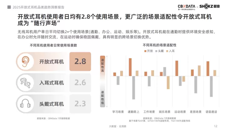 韶音的成功,源于对用户 “场景化需求” 的精准捕捉与落地。报告显示,开放式耳机用户日均切换场景达 2.8 个,远超入耳式与头戴式耳机,其 “开放不堵耳、佩戴无负担” 的特性,完美适配全天候听音需求。可以看出,用户对开放式耳机的使用场景已拓展至通勤、办公、运动、娱乐等多元领域,其开放、稳固的佩戴优势更能满足全天候的听音需求。