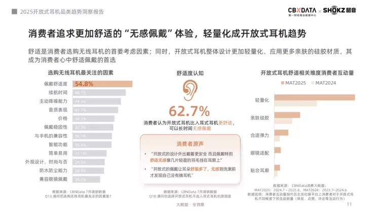 与此同时,报告里的两组数据同样值得关注:58%的消费者每天都使用无线耳机,36%的用户平均一天使用无线耳机的时长超过3小时。在高强度佩戴需求下,佩戴舒适度已成为消费者选购无线耳机选购的最重要的考量因素。