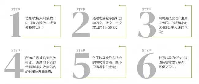 作为核心技术的 “三位一体” 系统(投放口、传输管道、收集中心),通过全封闭自动化流程构建起完整的垃圾收集、处理闭环:用户通过场景化投放口分类投放垃圾后,管道依托真空负压技术实现高效传输,最终在收集中心完成集中处理。针对智慧新城、医疗场所、商业综合体、高端住宅、大型厨房等不同场景,系统会针对性优化投放口设计与传输效率参数,精准适配差异化需求。