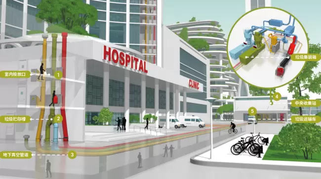 医疗领域是恩华特系统的特色应用场景。针对医院污衣被服及医疗垃圾的特殊处理需求,系统设置了专属投放口:垃圾及污衣被服分类投入后,在风机驱动下以70km/h速度抽运至中央收集站。其中,垃圾被集中收纳至专用集装箱,由环卫车转运处理;污衣被服则直接输送至洗衣房,进入清洗消毒流程。